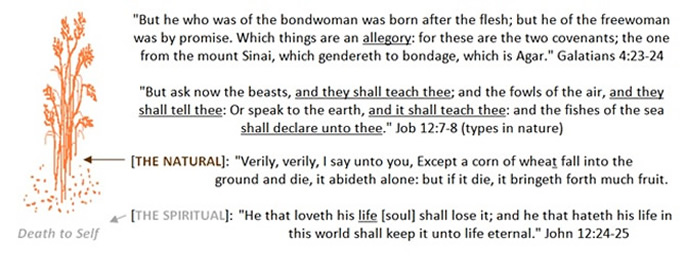 God used typologies to further show that He and He alone authored the books of the Bible. Of course the carnal mind will never perceive the works of God no matter how well one explains it. Yet once the underlying links, principles, and dominate themes within the books of the Bible are revealed by the Spirit, the person of faith cannot help but to marvel and rejoice at GOD'S magnificence. This understanding alone has brought many reasonable people to the inevitable conclusion that the Bible (though they still do not understand it all) is the inspired Word of GOD. Parables are the most obvious way that hidden meanings were put into the Word. Types are also used in conjunction with parables as they test not only the natural understanding but the reader's heart as well. In the Bible it is called "deep calling unto deep." Jesus made it very clear during His earthly ministry that His Father's desire is that our responses to His Word would first come from the heart and not from some religious reaction of the mind. In other words the mind may be fruitless to God's message within the message, but once the types are revealed with understanding, they greatly help to confirm and bring the fullness of that understanding to many other verses that were previously obscured through the lack of this knowledge.